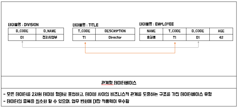 - 💡 데이터를 테이블의 형태로 저장하며, 각 테이블은 행(레코드)과 열(필드)로 구성되어 있다. 테이블 간의 관계는 공통 필드를 통해 형성된다.
