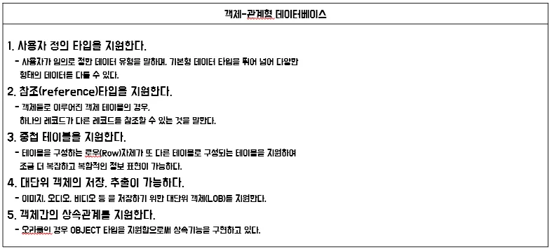 - 객체-관계형 데이터베이스(ORDBMS, Object-Relational Database Management System)RDBMS는 RDBMS의 테이블 구조와 SQL의 강력한 쿼리 기능을 유지하면서, 객체 지향 프로그래밍의 유연성과 복잡한 데이터 구조를 지원하는 것이 특징이다.