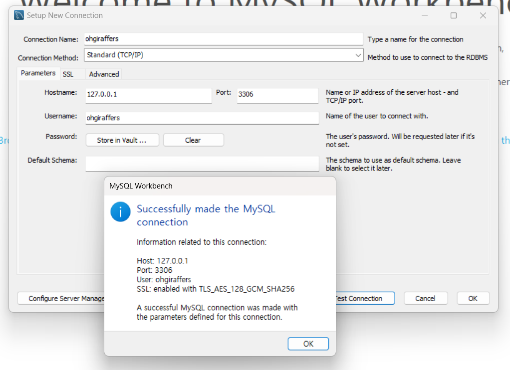 connection Name 에는 앞서 작성한 유저의 name을 입력해야함.