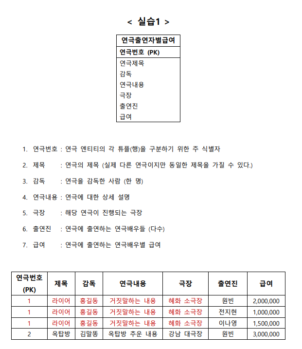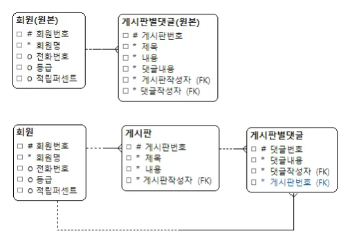 1. ERD 다이어그램 그리기 (1차 정규화 실습내용(문제,오답,정답))