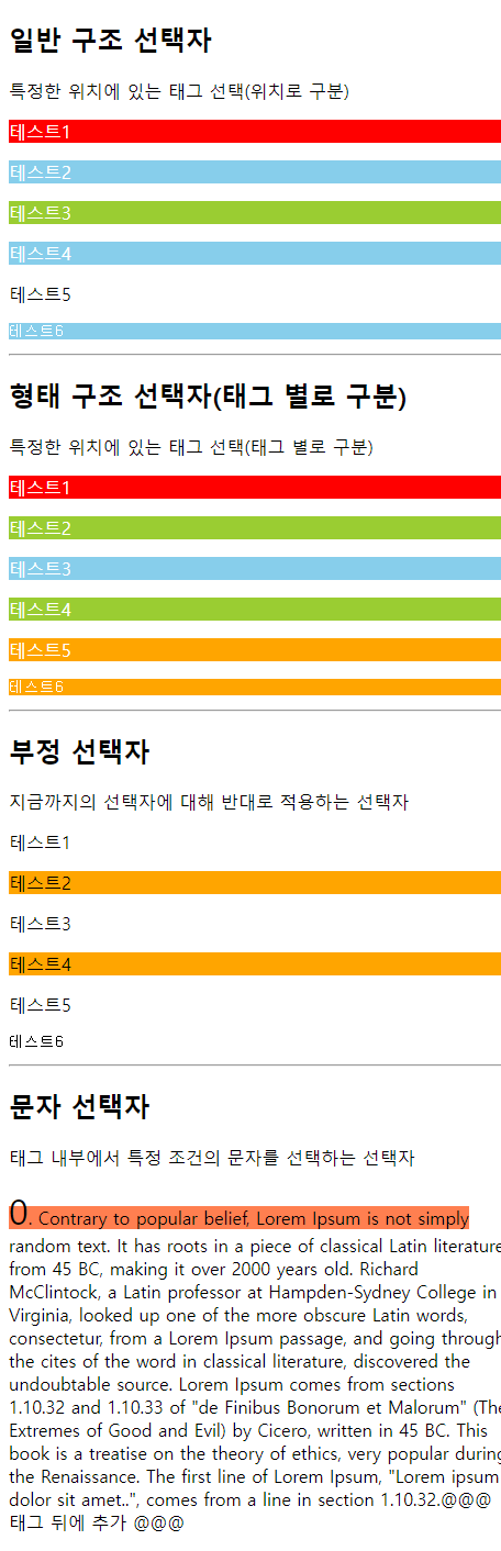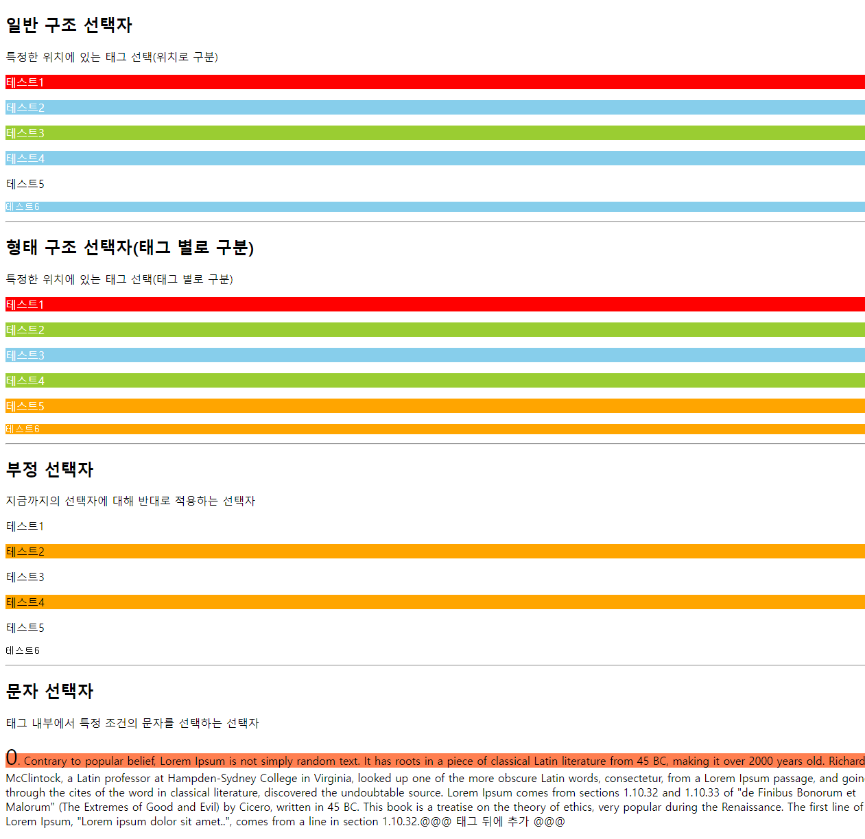 <p>태그 내부에서 특정 조건의 문자를 선택하는 선택자</p>