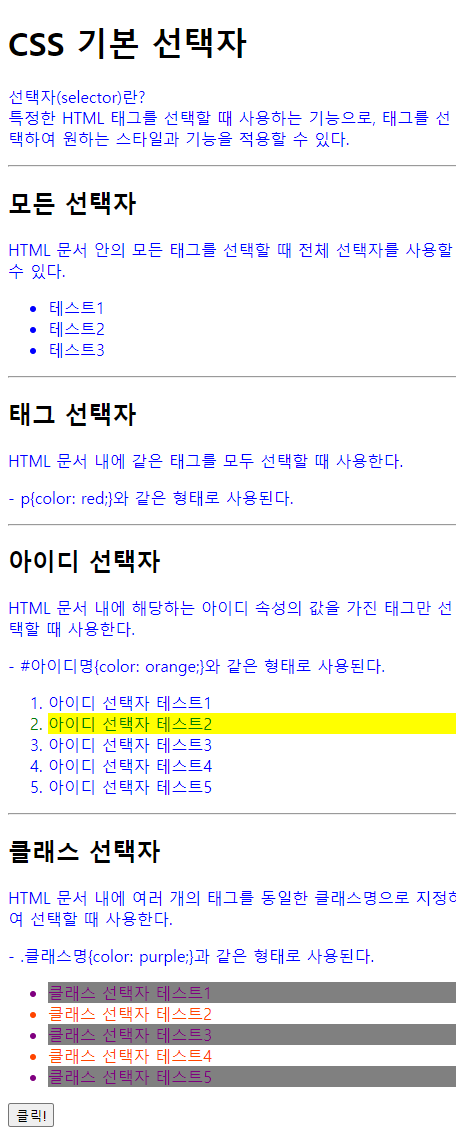 | ID 선택자 | #아이디이름 | 특정 ID를 가진 요소 선택 |